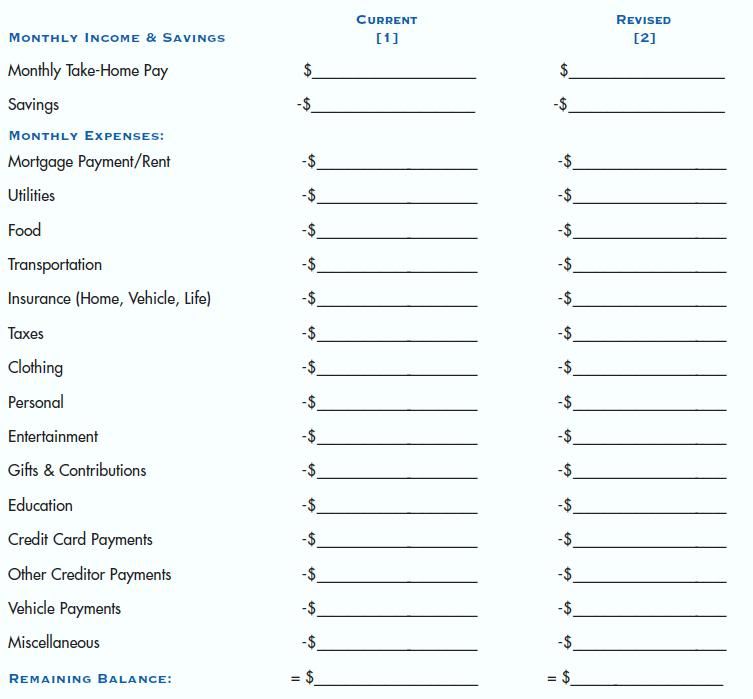 1.Complete Column 1 based on your current situation. Start with your monthly take-home pay. This is the amount you have left after taxes and other deductions have been made.