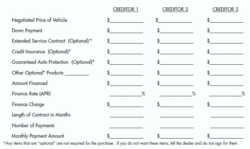Take the time to know and understand all of the terms, conditions and costs to finance a vehicle before you sign the contract. Review and compare the financing terms offered by more than one creditor.
