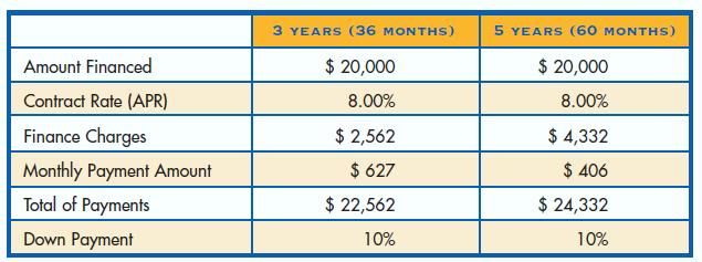 This example will help you compare the difference in the monthly payment amount and the total payment amount for a 3-year and a 5-year credit transaction. Generally, longer terms mean lower monthly payments and higher finance charges. Make sure you have enough income available to make the monthly payment by reviewing your monthly spending plan. You’ll also need to factor in the cost of automobile insurance, which may vary depending upon the type of vehicle.